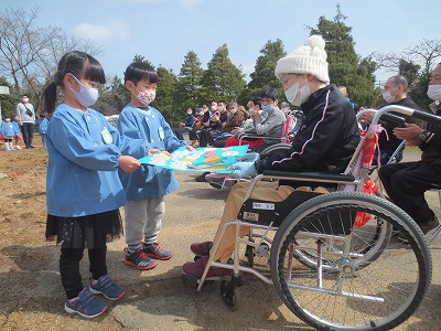 年長・年中組が、遊戯室で歌や踊りを披露します。