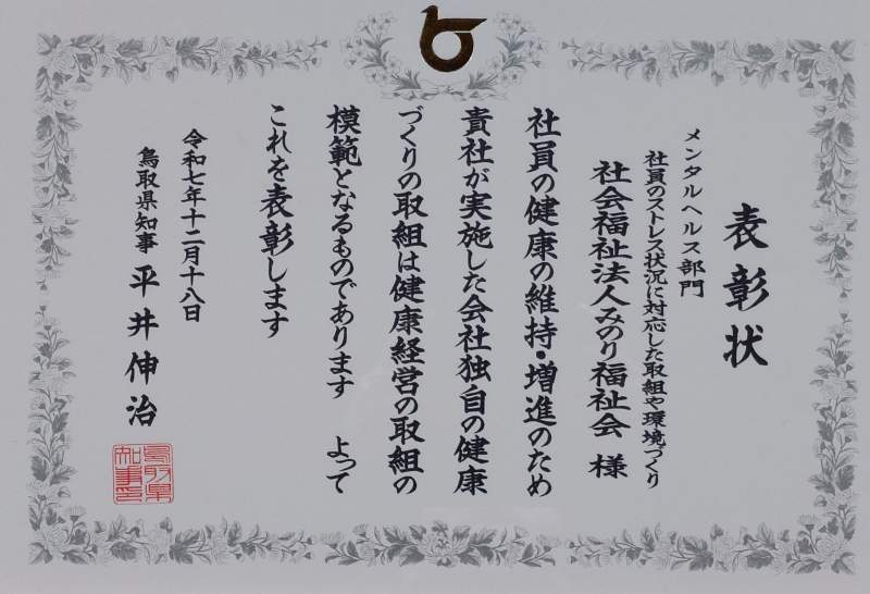 鳥取県・協会けんぽ鳥取支部認定より「社員の健康づくり宣言」事業所として認定されました |