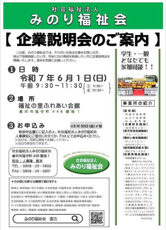 企業説明会を開催しました。 会場:福祉の里ふれあい会館(倉吉市福守町448-1) PDF |
